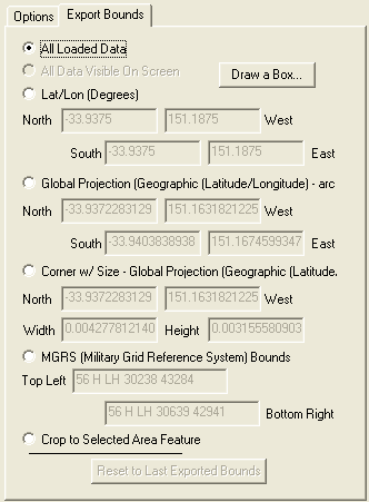 MGRS (Military Grid Reference System) BoundsAllows the user to specify the subset to export by entering the northwest and southeast corners of the bounding box to export in MGRS coordinates. The default values automatically filled in result in a bounding box containing all loaded compatible data.