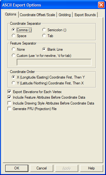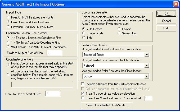 The Coordinate Column Order section allows the user to specify in what order the coordinates are found on coordinate lines in the file. Coordinates can either be x followed by y (i.e. longitude then latitude) or the reverse. Elevation values, if any, are always assumed to come after the x and y values. The Fields to Skip at Start of Line setting controls what field index (column) the coordinates start in. For example, if the x and y coordinates are in the 3rd and 4th columns, set this value to 2 so that the coordinates will be grabbed from the appropriate place.