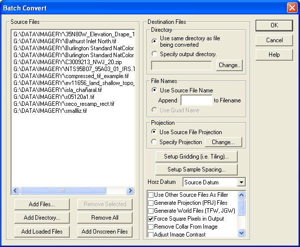 The Source Files section displays the list of source files currently selected to be converted. Pressing the Add Files... button allows the user to select additional files for conversion. Pressing the Add Directory... allows the user to easily add an entire directory's worth of source files to the to-be-converted list. All directories under the added one can be recursively searched if so desired by answering Yes to the dialog that pops up immediately after selecting the directory. Pressing the Add Loaded Files button causes all files loaded into the main Global Mapper view that match that batch convert input type to be added to the list of files to be converted. Pressing the Add Onscreen Files button causes all files loaded into the main Global Mapper view that are currently at least partially onscreen and that match the batch convert input type to be added to the list of files to be converted.