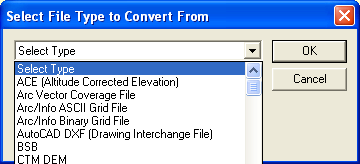 When the command is selected, the user is first prompted to select the file type to convert from using the dialog pictured below. Once an input file type is selected, another dialog with a list of all compatible export file types is displayed, allowing the user to select what type of file to convert the input files to. Finally, after the input and output file types are selected, the Batch Convert dialog (pictured below) is displayed, allowing the user to set up the batch conversion.