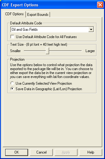 In the Projection section of the panel, the user can choose to save all loaded data in the currently selected view projection (this is the projection selected on the Projection tab of the Configuration dialog), in latitude/longitude coordinates (the "Geographic" projection) with the WGS84 datum, or to keep each layer in its original native projection.