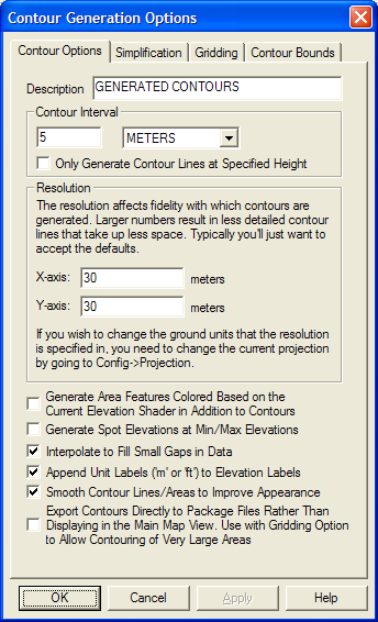 The Contour Options panel (displayed above) allows the user to set the contour interval and units as well as the grid spacing to use when generating the contours. In addition, options are available to generate isoheight area features in addition to contour lines as well as spot elevations at the highest and lowest points in the area over which the contours are generated. The smoothing option controls whether or not extra vertices are added along generated line and area features to improve their appearance. If you need to generate a huge amount of contour lines over a large area, the option to export the contours directly to a package file can be used in addition to the Gridding tab options to export those contours directly to package files to get around memory limitations. Note that the contour lines will be generated so that the higher elevations are to the left of the contour line.
