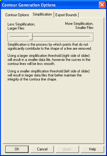 The Simplification panel (displayed below) allows the user to set up the threshold at which points that don't contribute much to the shape of the generated contour are removed in order to generate lines with less vertices. The Gridding panel allows you to break up your contour generation into smaller pieces which can sometimes help reduce memory requirements when generating a very large amount of contour lines. The Export Bounds panel allows the user to set up the portion of the loaded elevation grid data they wish to consider when generating the contours.