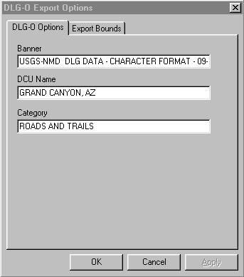 When selected, the command displays the DEM Export Options dialog which allows the user to setup the export. The dialog consists of a General options panel which allows the user to set up the quadrangle name, grid spacing and vertical units, a Gridding panel, and an Export Bounds panel which allows the user to set up the portion of the loaded data they wish to export.