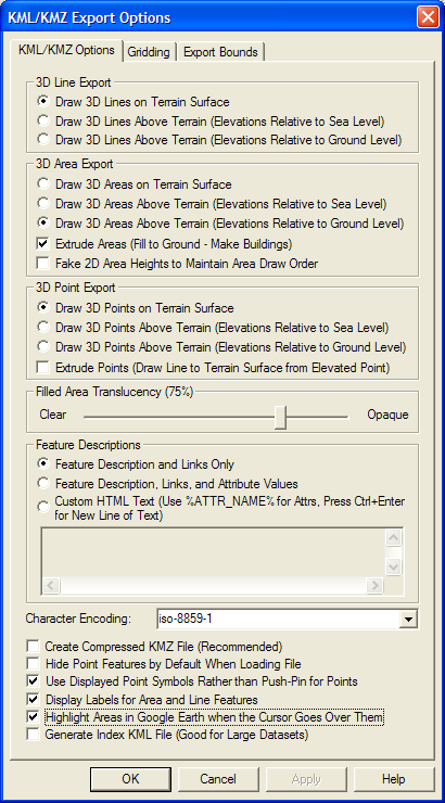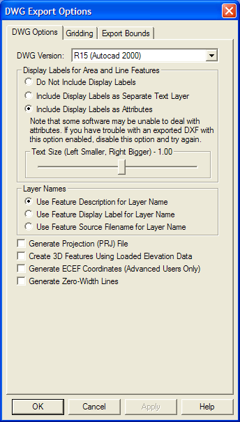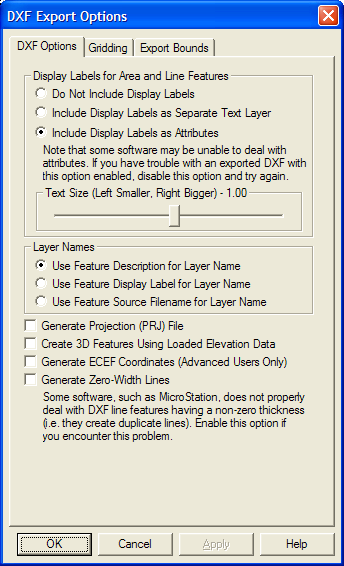 When selected, the command displays the DTED Export Options dialog which allows the user to setup the export. The dialog consists of a DTED Options panel which allows the user to set up the DTED level and other options, a Gridding panel, and an Export Bounds panel which allows the user to set up the portion of the loaded data they wish to export.