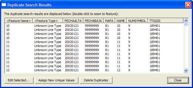When you select the menu item you are first prompted to select which attribute (including feature name) to search for duplicates on, then the search proceeds and any duplicate values are display in the Duplicate Search Results dialog (picture below). This dialog allow you to view the features with duplicate results and to edit those features or automatically assign new unique values. You can also press the Delete Duplicates button to mark the duplicate features as deleted. When doing this you will have the option to mark all duplicates (except for the first one) as deleted, or to just delete the duplicate features that also have duplicate coordinates (this is what you'll most often want to do).