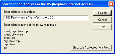 Find AddressThe Find Address command displays the Search for an Address in the US dialog (pictured below) which allows searching for an address, city, or zip code in the United States.