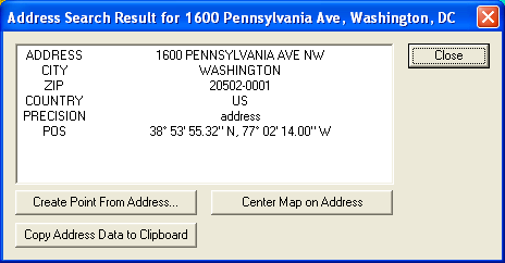 If an address is found that matches the requested location, a results dialog (see sample below) is displayed with the matching location information, as well as button to allow creating a new point feature at the address location, re-centering the map view on the address, and copying the address information to the Windows clipboard for easy pasting into another application.