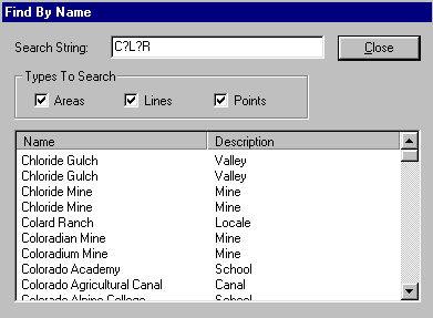 The Find By Name dialog displays a list of all of the vector features (areas,lines, and/or points) whose label starts with the search string specified in the Search String field. This field can contain the ? and * wildcard characters. In addition, one can control which vector object types (area,line, and/or point) to include in the search. Double-clicking on an item in the list will recenter the view on that object and show a bullseye on it (hold down the ALT key when double-clicking to not show the bullseye).