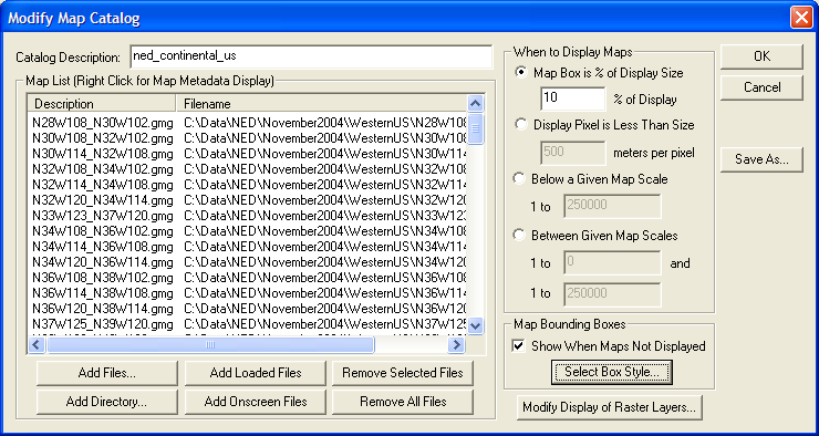Upon selecting this command and selecting the file to save the map catalog to, the Modify Map Catalog dialog (shown below) will be displayed, allowing you to add files to the catalog, control at what zoom level data layers are loaded for display, and setup how the map bounding boxes are displayed when you are zoomed out too far for the actual map data to display. By default map bounding boxes are displayed using the style set for the Map Catalog Layer Bounds type.