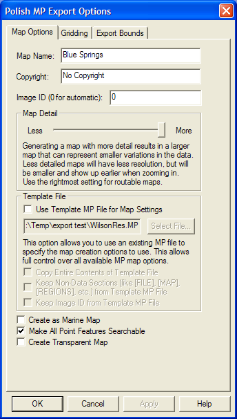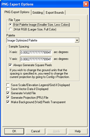When selected, the command displays the BMP Export Options dialog which allows the user to setup the export. The dialog consists of a General options panel which allows the user to set up the pixel spacing, a Gridding panel, and an Export Bounds panel which allows the user to set up the portion of the loaded data they wish to export.