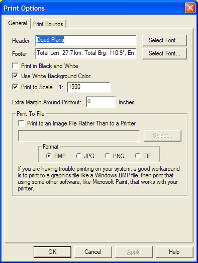 The Print To File section allows you to specify that the printout be directed to an image file rather than to the printer. This can be handy if you either want to save the results of the printout to email to someone or post on a web site, or you are having trouble printing and would like to print out the data generated by Global Mapper using another application.