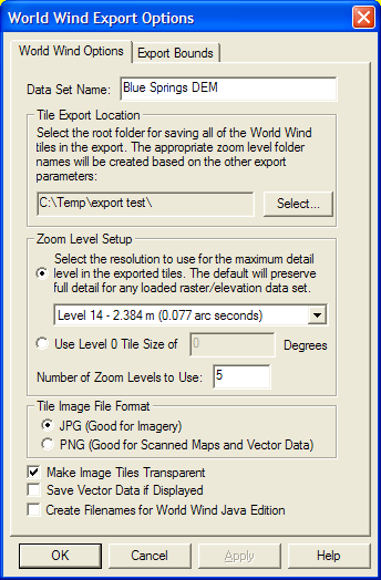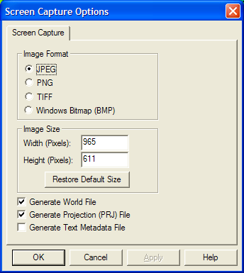 Checking the Generate World File option results in a world file being generated in addition to the image. The world file will be generated in the same directory as the image and will have the same primary name as the image. The filename extension will depend on the selected image type (JPEG=.jpgw, PNG=.pngw, TIFF=.tfw,BMP=.bmpw).