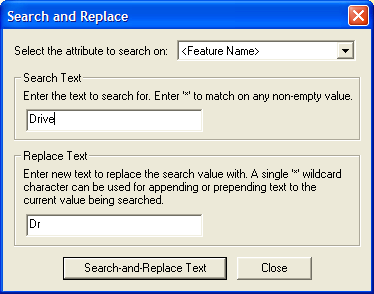Search and ReplaceThe Search and Replace command allows for searching for a particular text string in the attributes and name of loaded features and replacing that with some other text string. When you select the command, the Search and Replace dialog (pictured below) is displayed, allowing you to setup the search-and-replace operation.