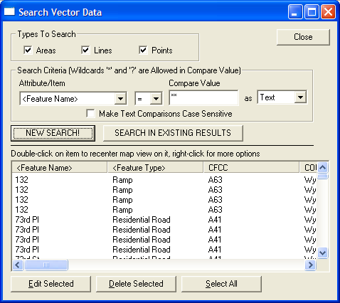 The Search Vector Data dialog displays a list of all of the vector features (areas, lines, and/or points) which match the specified Search Criteria. The Search Criteria can be applied to any attribute value of the loaded features, the display label field, or the description/type field. Comparisons to the Compare Value can be done either textually or numerically. For text equal and not-equal searches, the Compare Value field can contain the ? and * wildcard characters.
