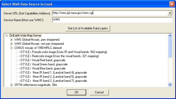You can use the Add WMS Data Source button to display the Select WMS Data Source to Load dialog (pictured below). This dialog allows you to specify the URL of a WMS data source and select what layer(s) to add as an available data source on the Select Online Data Source to Download dialog. The URL that you should specify is the GetCapabilities URL, such as http://wms.jpl.nasa.gov/wms.cgi for the JPL WMS data server (a great source of data, like Blue Marble imagery). Once you've entered the URL, press the Get List of Available Data Layers button to query the server and populate the data control with the available data layers on that server. Then simply select the data layer and style that you want and press OK to have it added to the available data source list. Once a source is added, you can use the Remove Source button to remove it from the list of available data sources at a later time. If you need to specify additional options for the WMS server, such as forcing a particular image format to be used, add those parameters after the Service Name parameter. For example, to force the use of the JPG format, you might specify a Service Name parameter of 'WMS&format=image/jpeg'.
