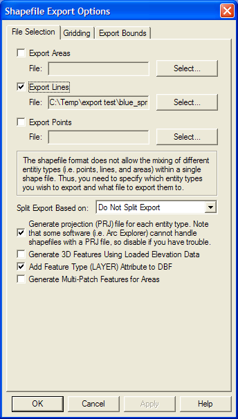 Only those line features with an elevation and/or valid roughness attributes will be exported. Only those area features with valid roughness attributes will be exported. Valid roughness attributes consist of a ROUGH_L and a ROUGH_R attribute containing numeric values for the left and right roughness for the feature. If neither of those attributes exist but a RV attribute is available, that value will be used for both the left and right roughness for that feature.