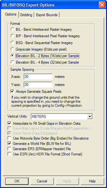 When selected, the command displays the BIL/BIP/BSQ Export Options dialog which allows the user to setup the export. The dialog consists of an Options panel (pictured below), which allows the user to set up type of export to perform, the sample spacing, vertical units, and other applicable options, a Gridding Panel, and an Export Bounds panel which allows the user to set up the portion of the loaded data they wish to export.