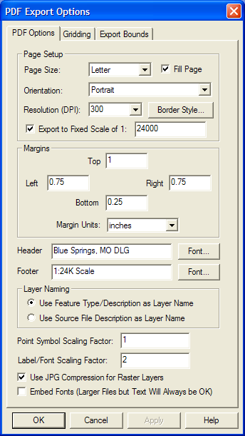 When selected, the command displays the PDF Export Options dialog which allows the user to setup the PDF export. The dialog consists of a PDF Options panel, a Gridding panel, and an Export Bounds panel.