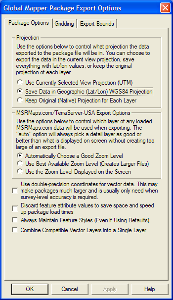 The Package Options panel consists of options allowing the user to select the projection to save the data in, how to handle dynamically streamed MSRMaps.com/TerraServer-USA data, and other options. These include the Always Maintain Feature Styles option, which specifies that any vector features stored in the package file should explicitly save the styling of that feature, even if they are using the default style for the feature classification. This can make it easier to maintain exact styling when transferring packages between Global Mapper installations.