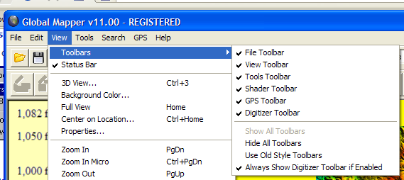Use this command to display and hide the Toolbars, which includes buttons for some of the most common commands in Global Mapper. A check mark appears next to the menu item when the Toolbar is displayed