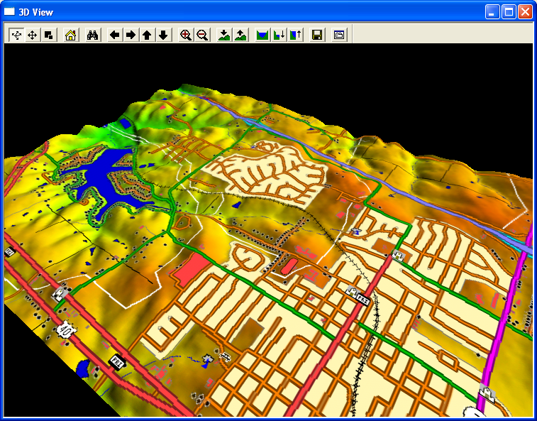 The 3D View window contains a toolbar with command buttons allowing you to modify the default view. You can use the mouse to rotate the view around as well as zoom in. The arrow keys on the toolbar allow you to pan the data visible in the 3D view in any direction. The zoom in and out buttons allow you to zoom in or out on the center of the 3D view. Additional buttons are also available for modifying the vertical exaggeration, displaying water, and saving the 3D view contents to a Windows BMP, TIFF, PNG, or JPG file.