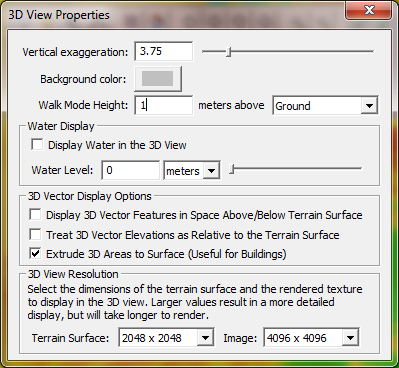 If you press the Change Display Properties button on the 3D toolbar the 3D View Properties dialog is displayed allowing you to configure the 3D view settings, including the vertical exaggeration, the water display, background color, 3D vector display, as well as the terrain and draped image resolution.